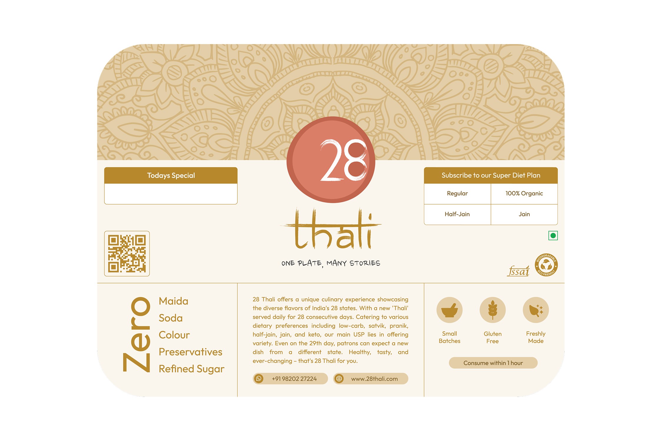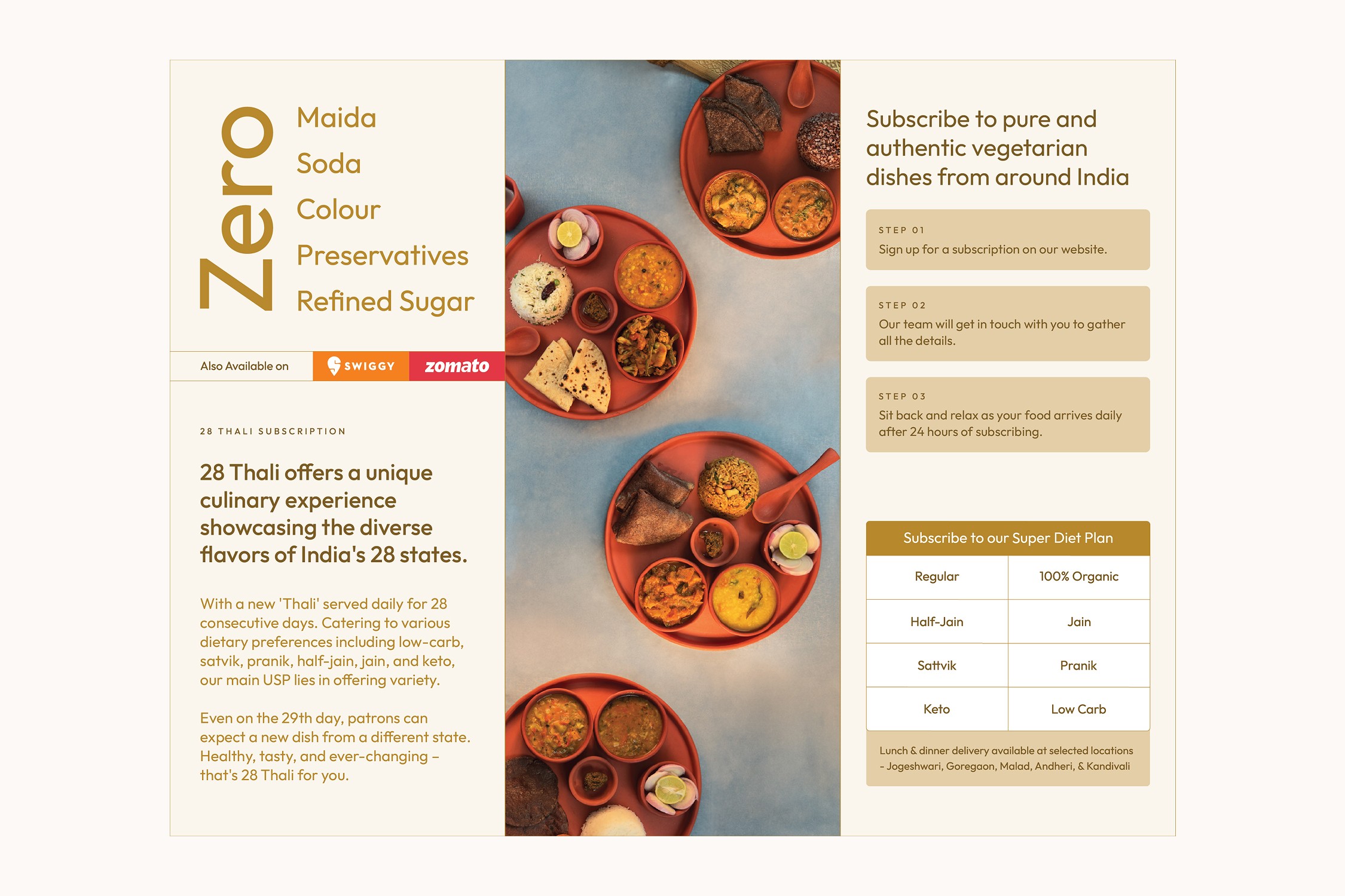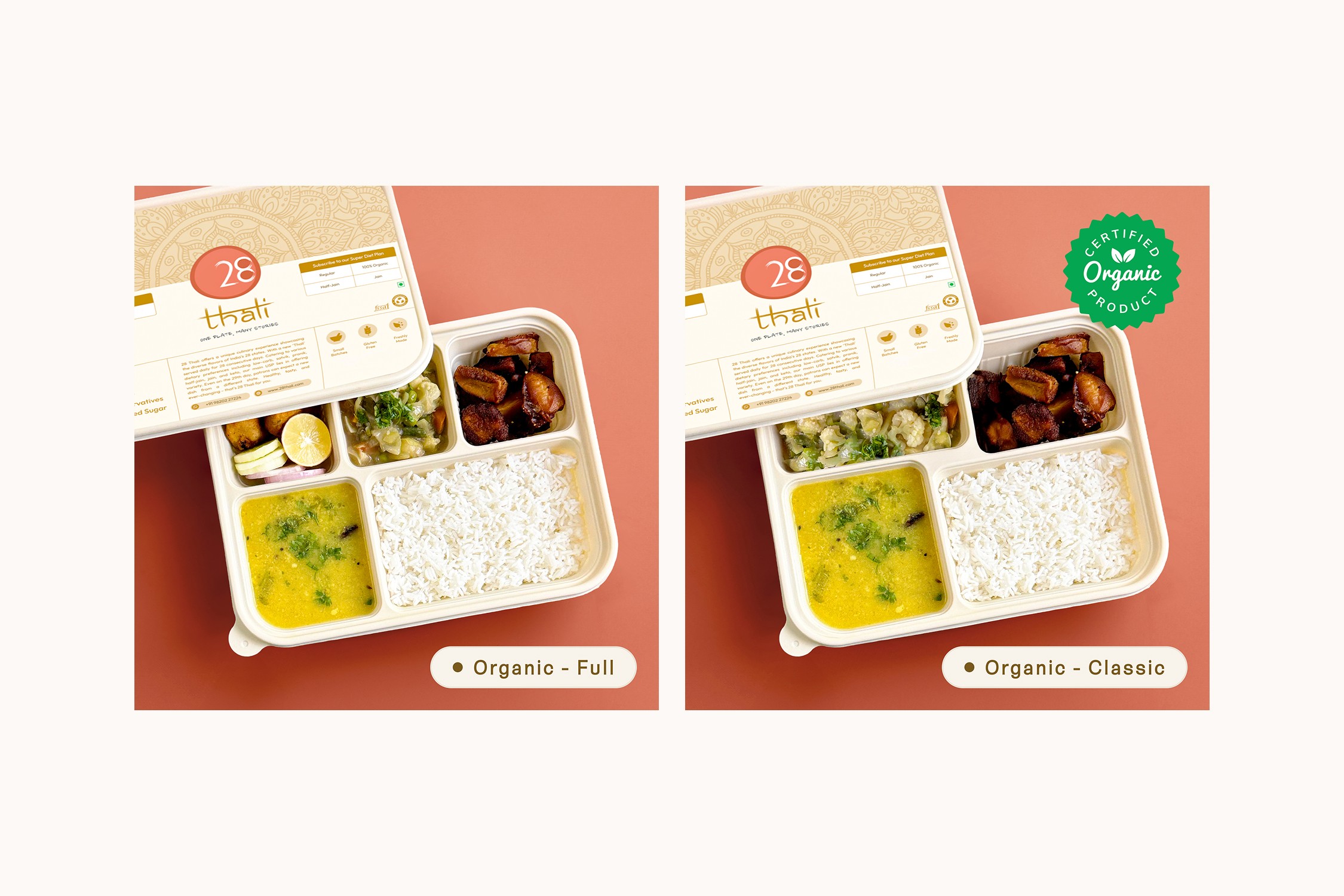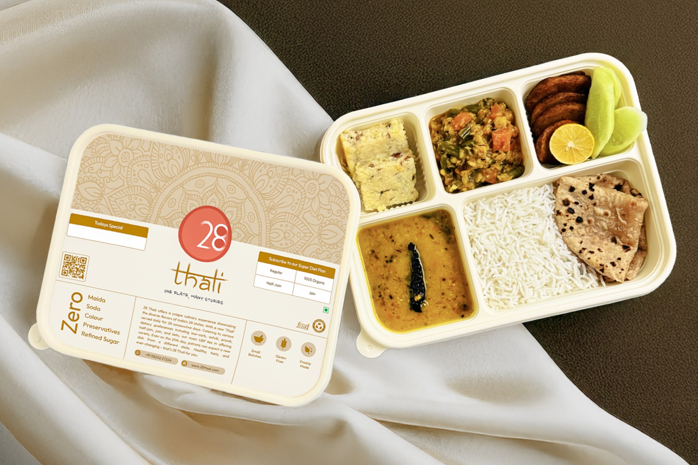 28 Thali is a Mumbai-based vegetarian subscription brand founded in 2023. It celebrates India’s culinary diversity with authentic, home-style meals, cooked using cold-pressed oils, Himalayan rock salt, and in-house masalas, and served in eco-friendly packaging that reflects its sustainable values.