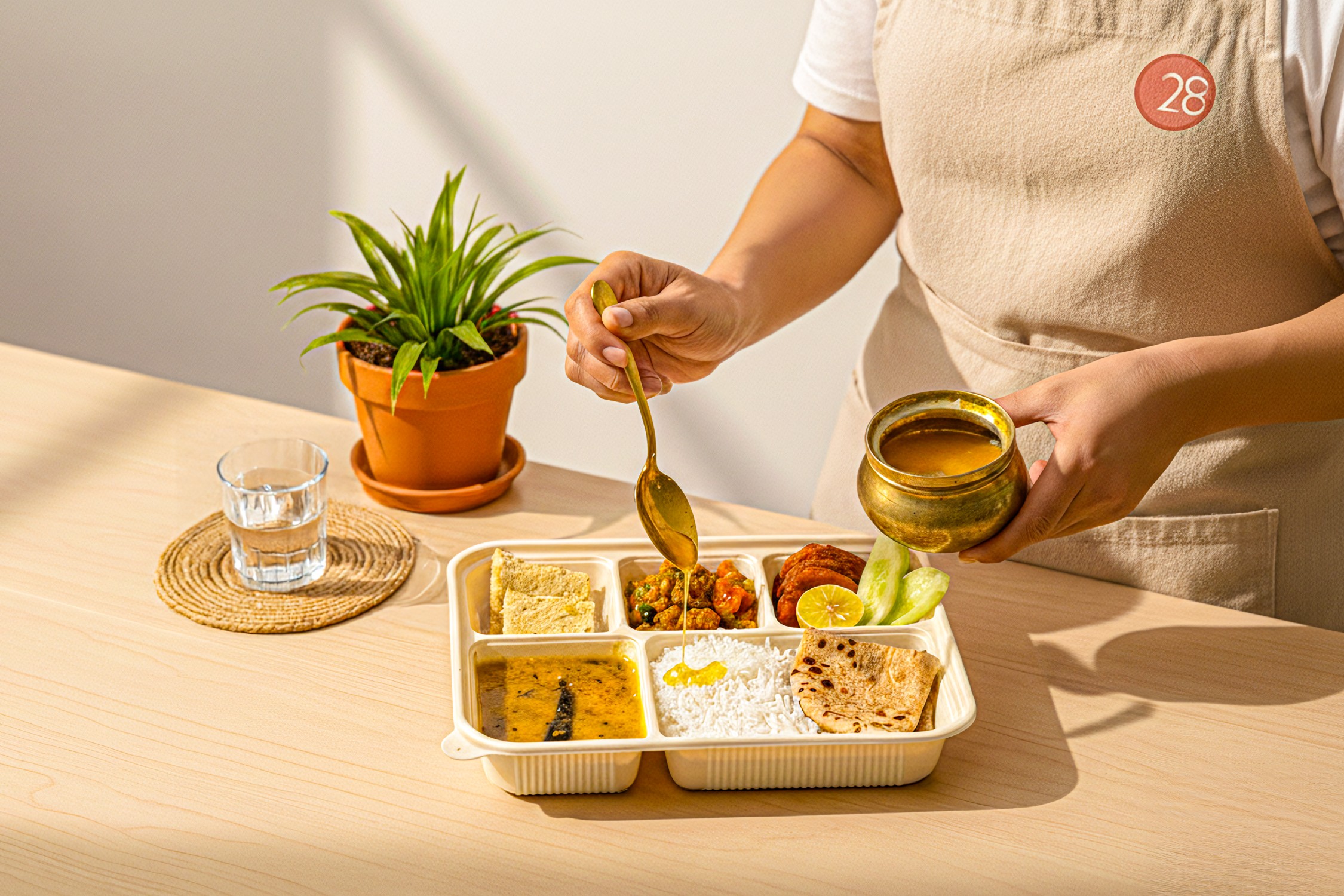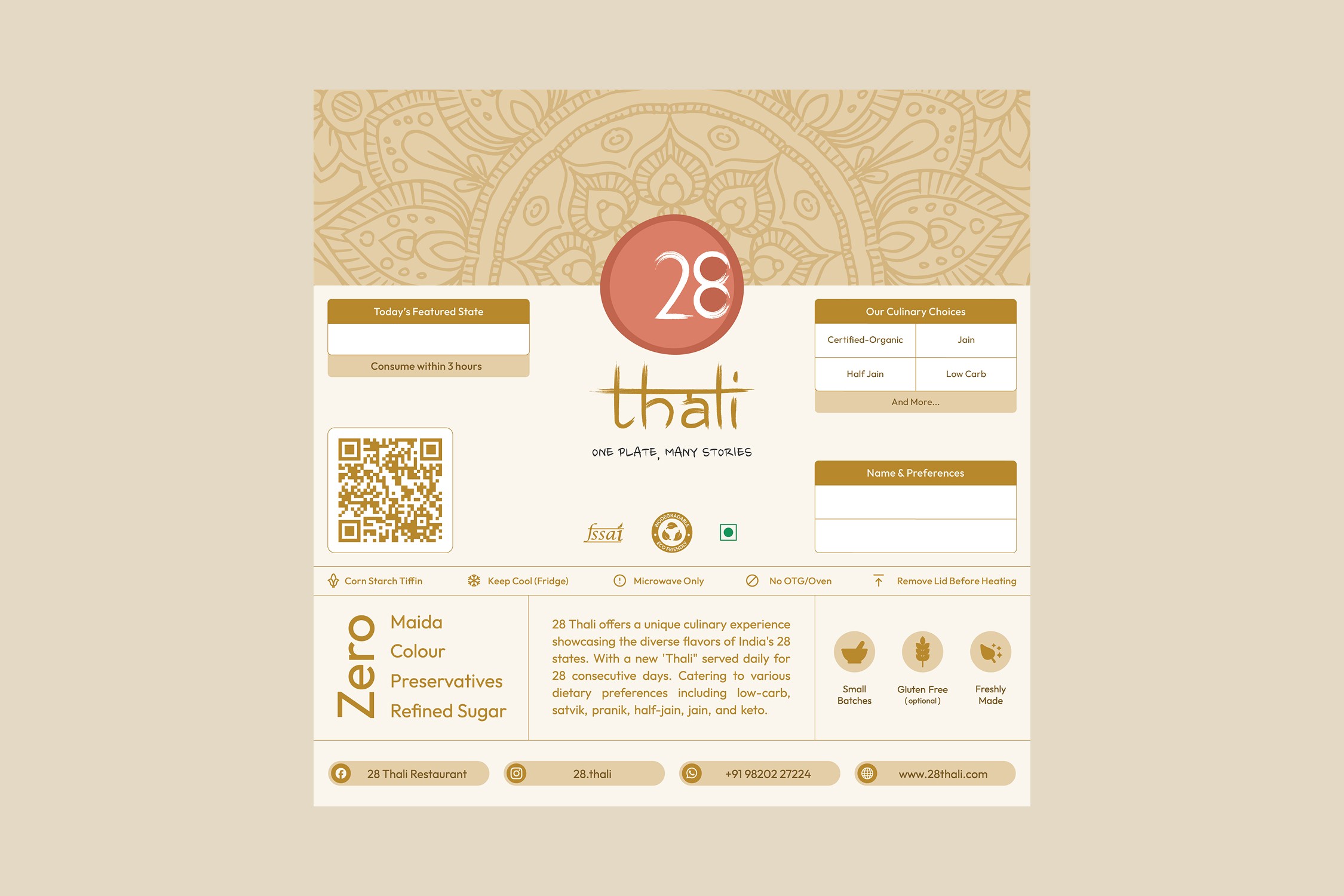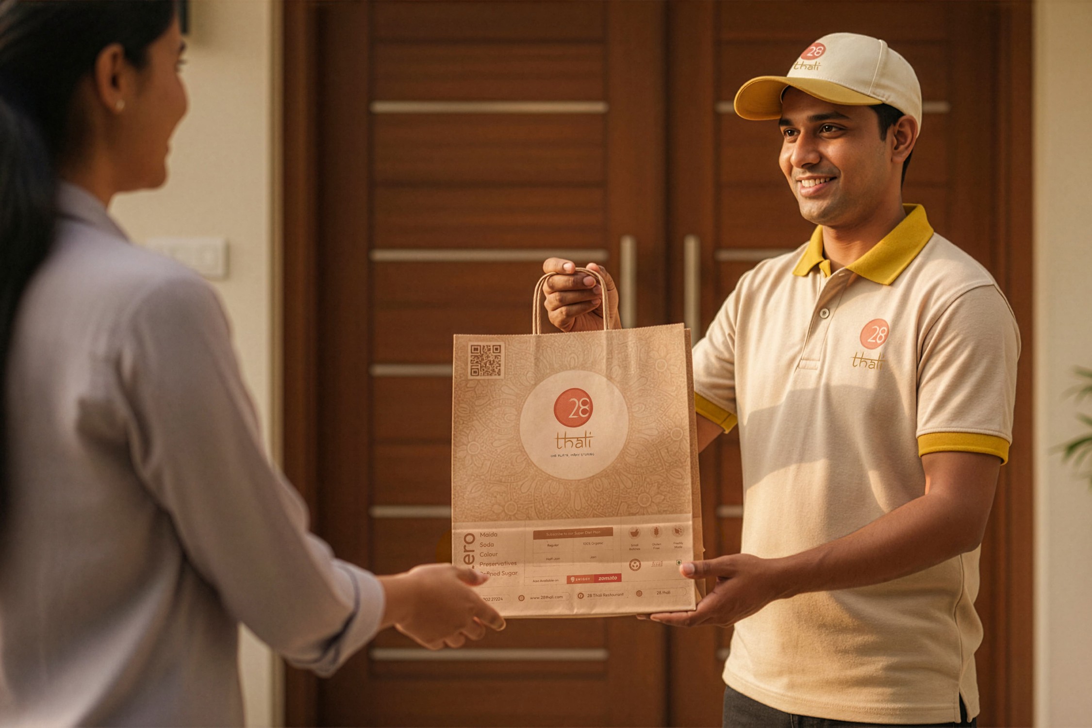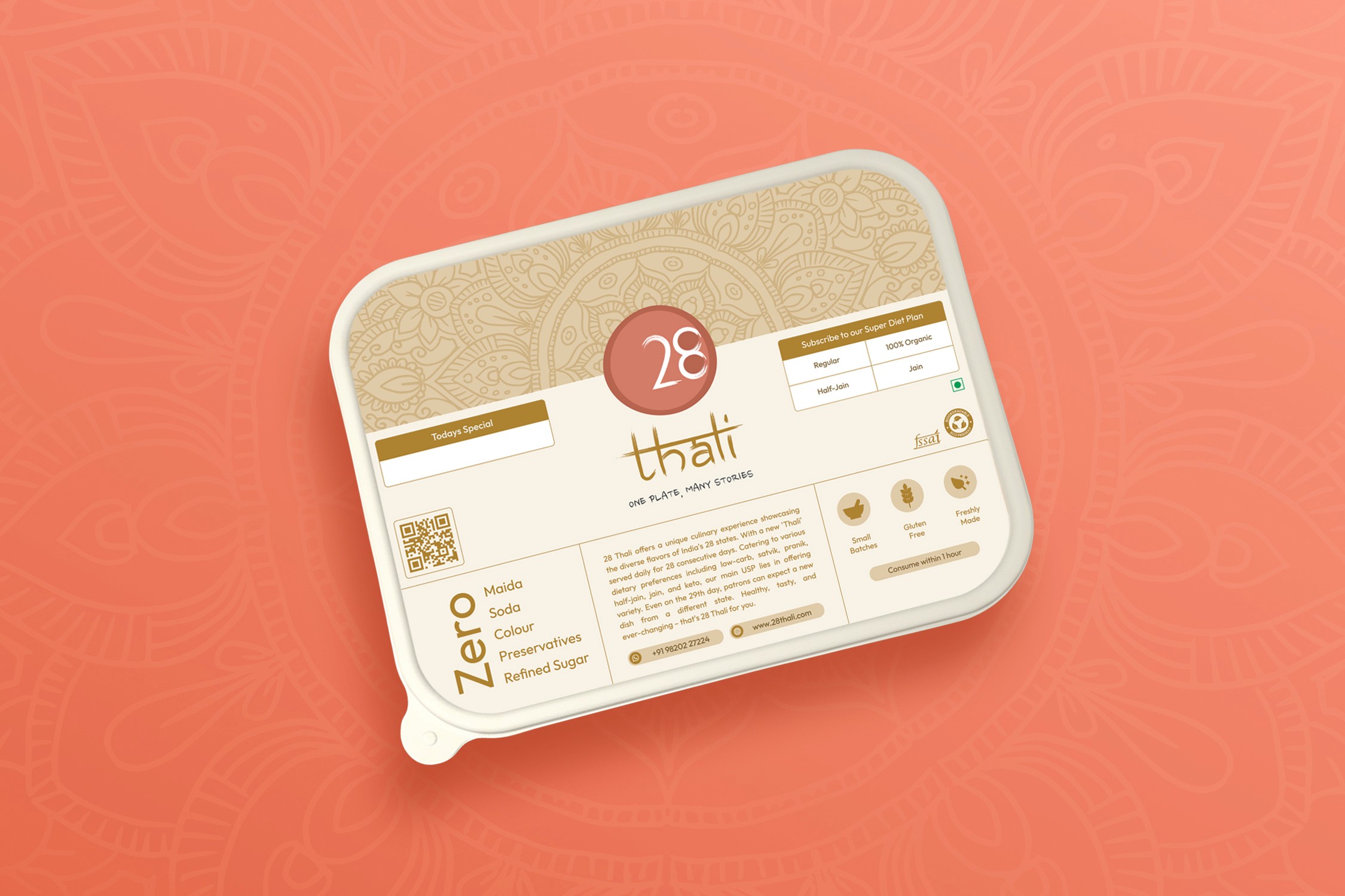 28 Thali is a Mumbai-based vegetarian subscription brand founded in 2023. It celebrates India’s culinary diversity with authentic, home-style meals, cooked using cold-pressed oils, Himalayan rock salt, and in-house masalas, and served in eco-friendly packaging that reflects its sustainable values.