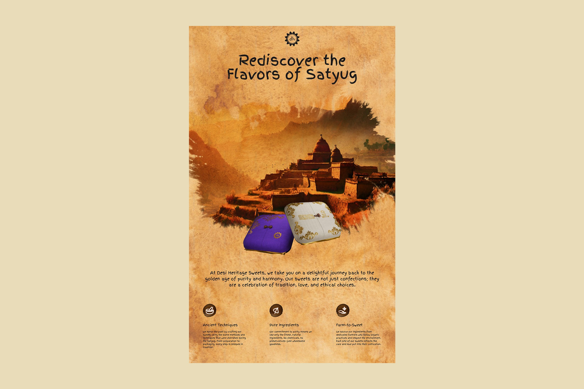 Desi Heritage Sweets revives the art of making sweets the way they were meant to be made. Rooted in traditions from the Satyug, every sweet is prepared using pure, natural ingredients and time-honoured methods, without preservatives, artificial flavours, or colours. Sourced responsibly from organic farmers and crafted with care, these sweets reflect a culture where food was slow, intentional, and nourishing, created not just to taste good, but to honour heritage, balance, and wellbeing.