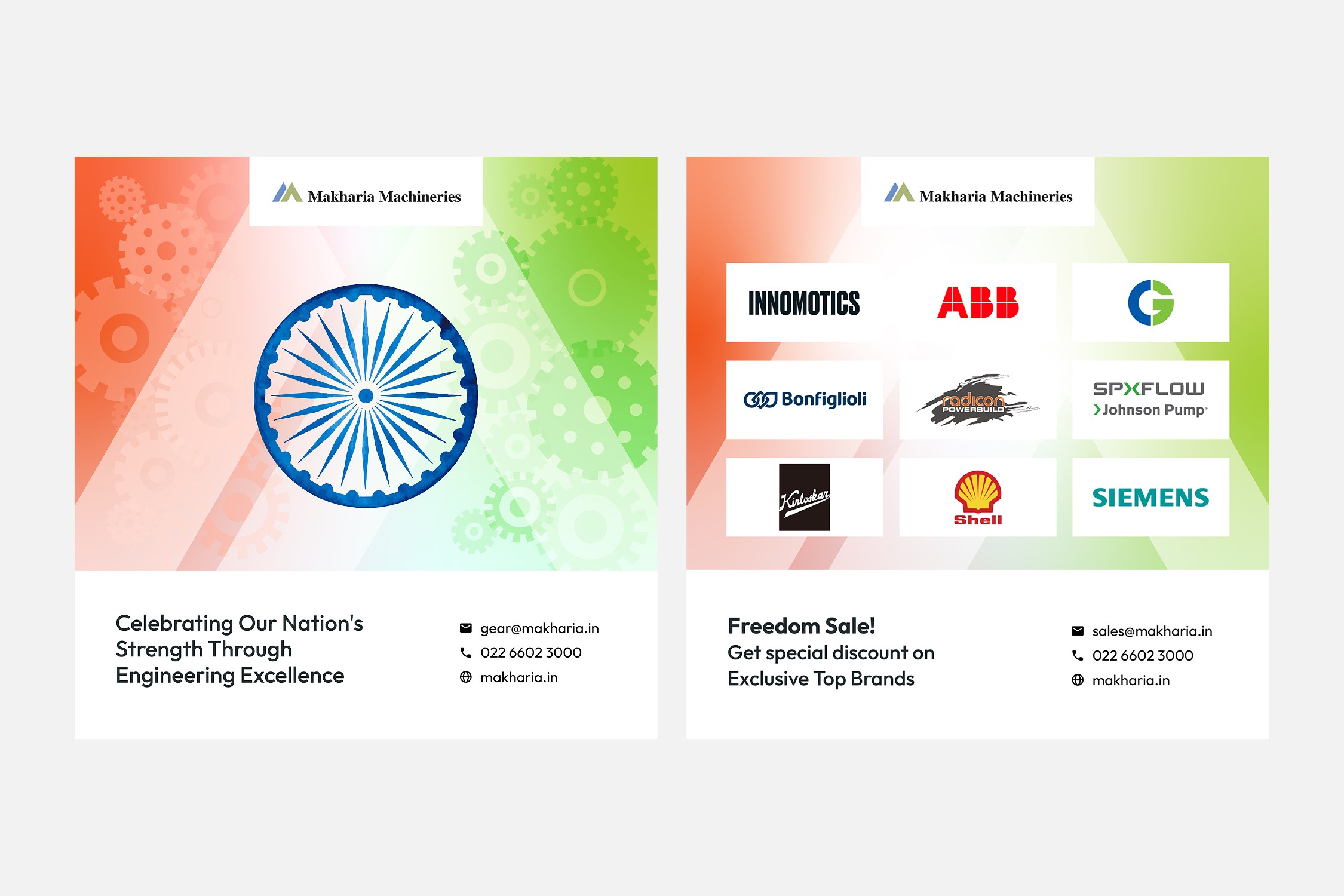 Makharia Machineries Pvt. Ltd is a pan-India industrial solutions provider serving over 5,200 clients across electrical, mechanical, and engineering domains. We supported the brand with Independence Day social media creatives that highlighted festive offers while maintaining Makharia’s core identity of reliability, scale, and industrial credibility. The posts balanced national sentiment with clear product-led communication, helping the brand stay visible, relevant, and timely across digital channels during a high-attention moment.