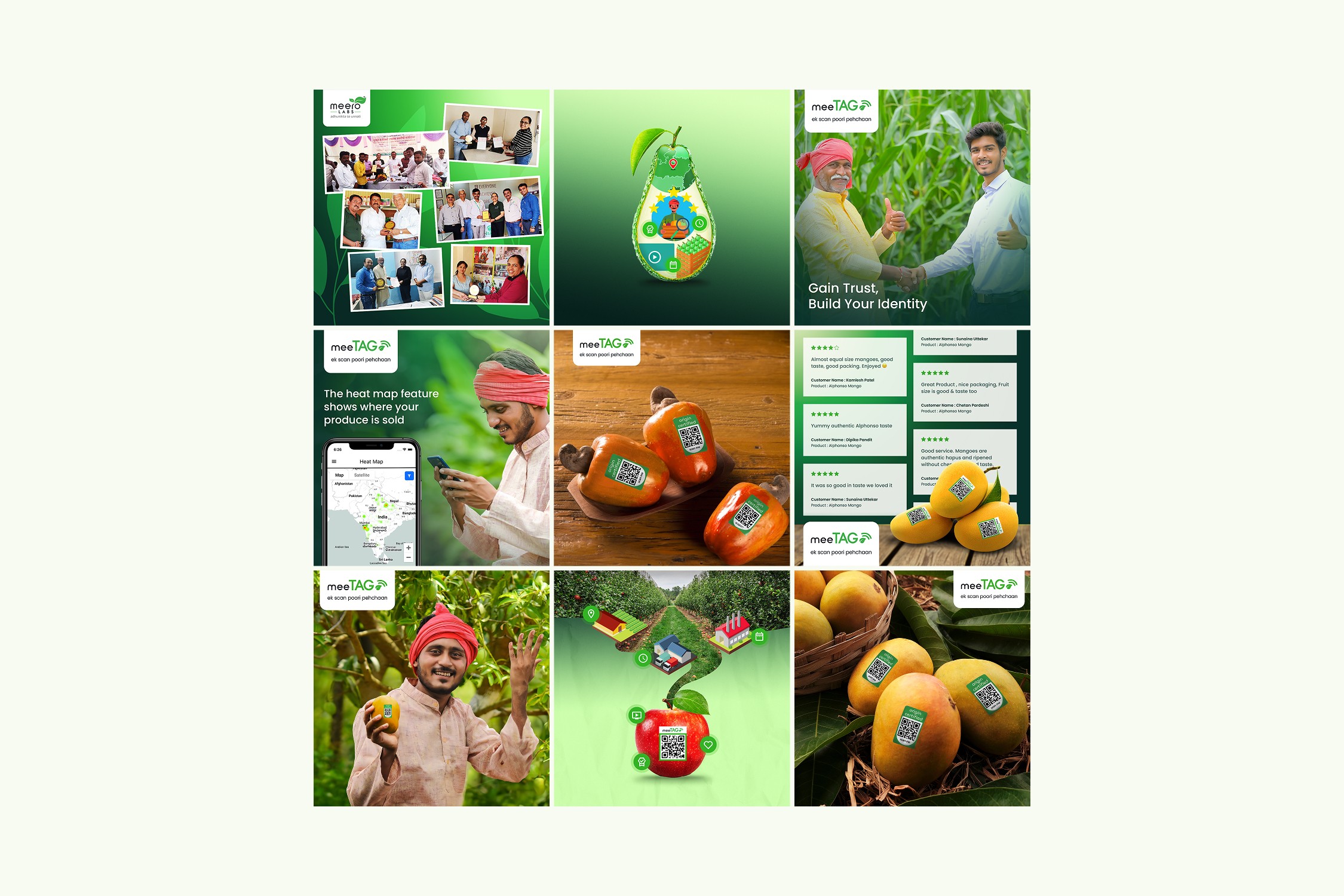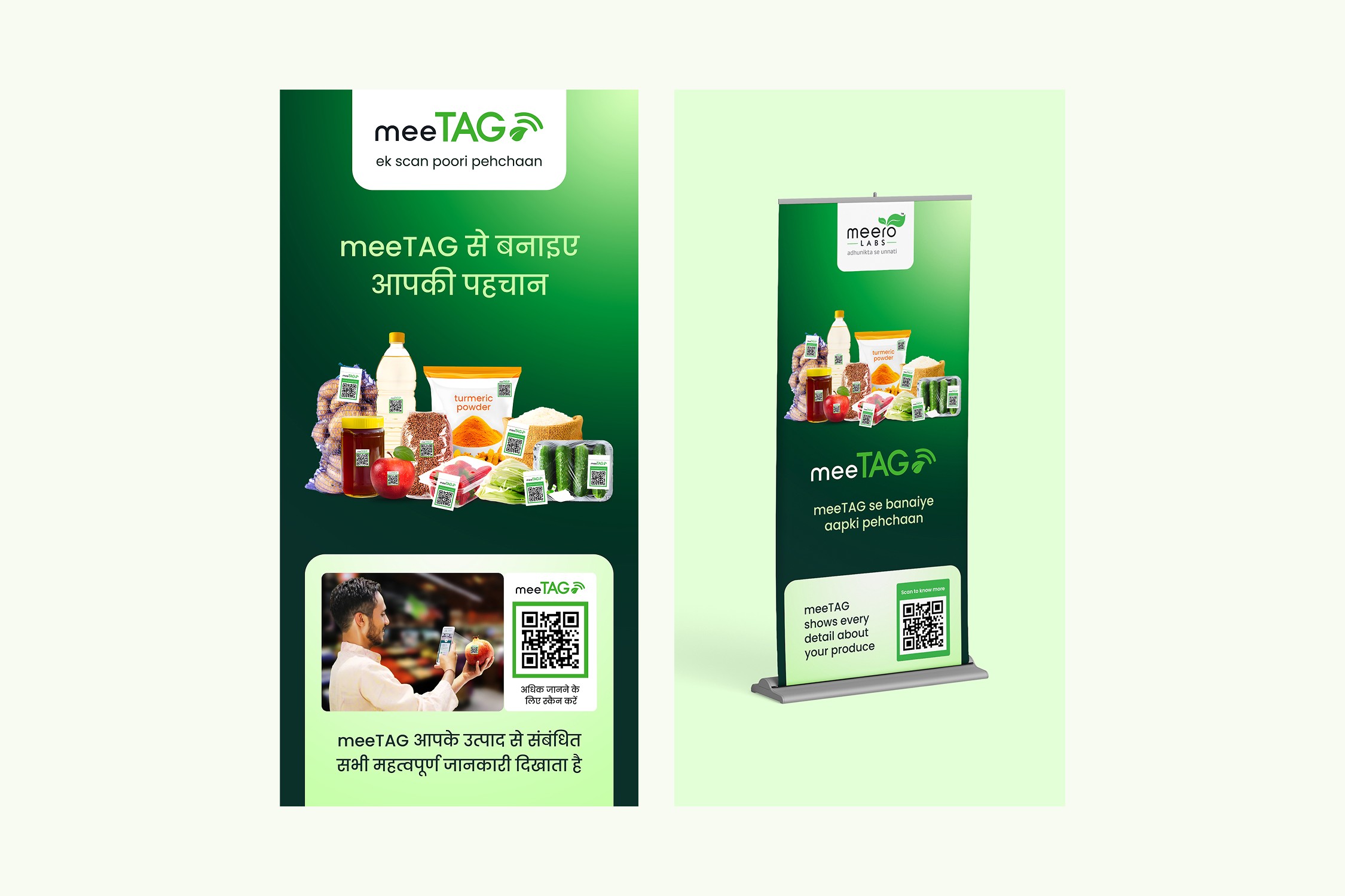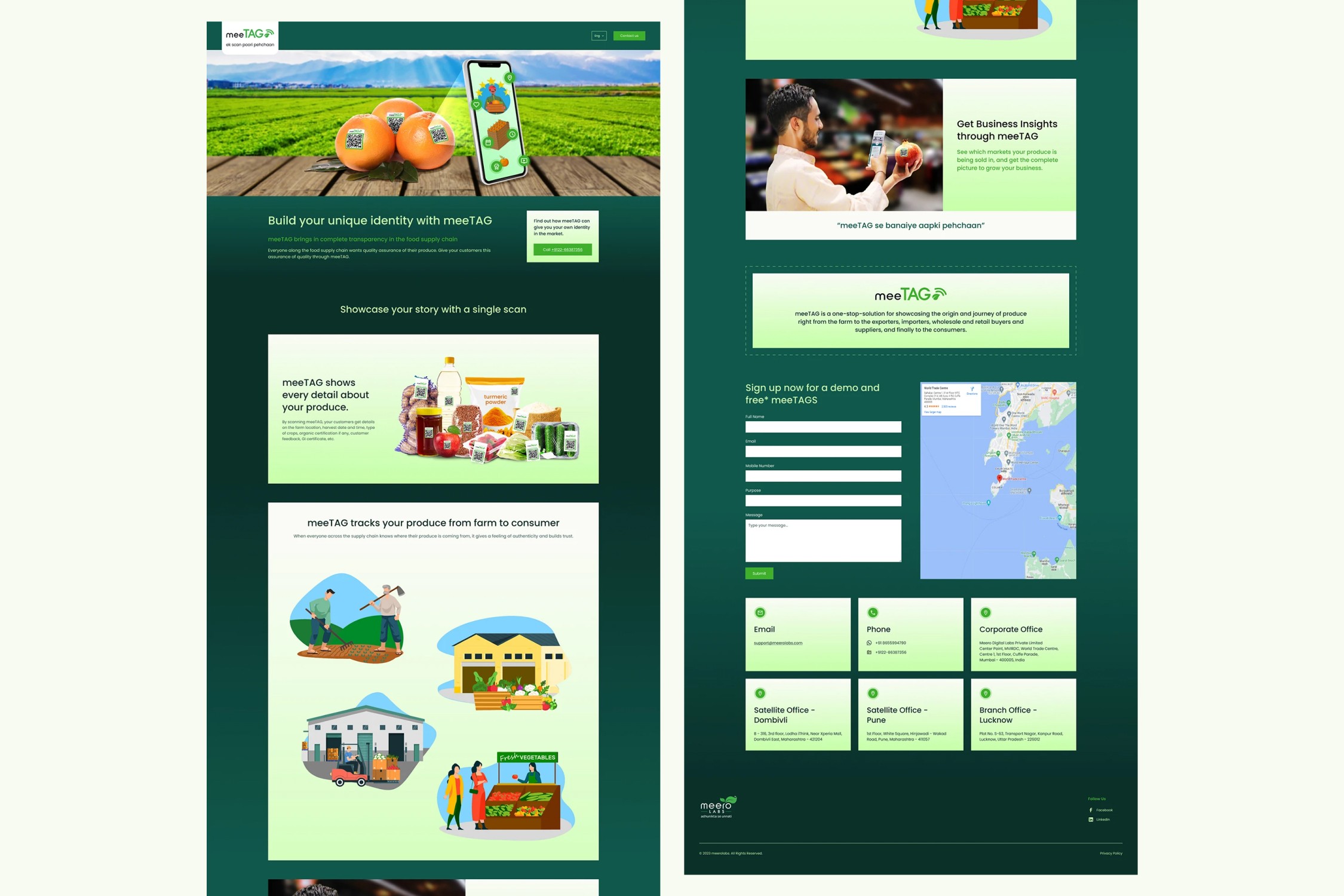 meeTAG is a QR-based traceability system developed by Meero Labs to bring full transparency to India’s food supply chain. Each tag connects consumers directly to verified details, farm location, harvest date, certifications, and farmer profiles, giving every product its own digital identity.