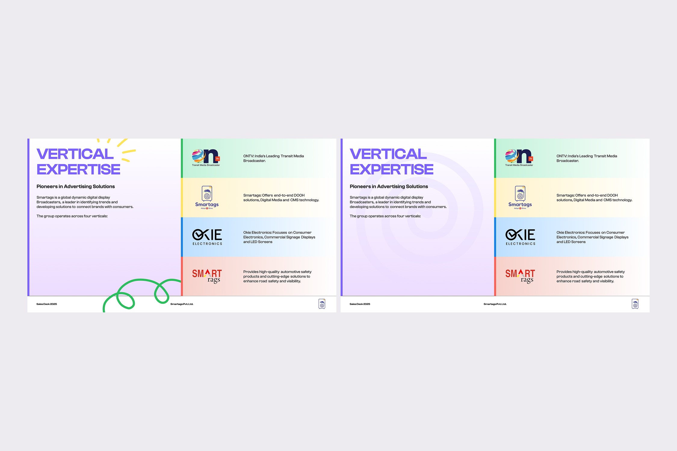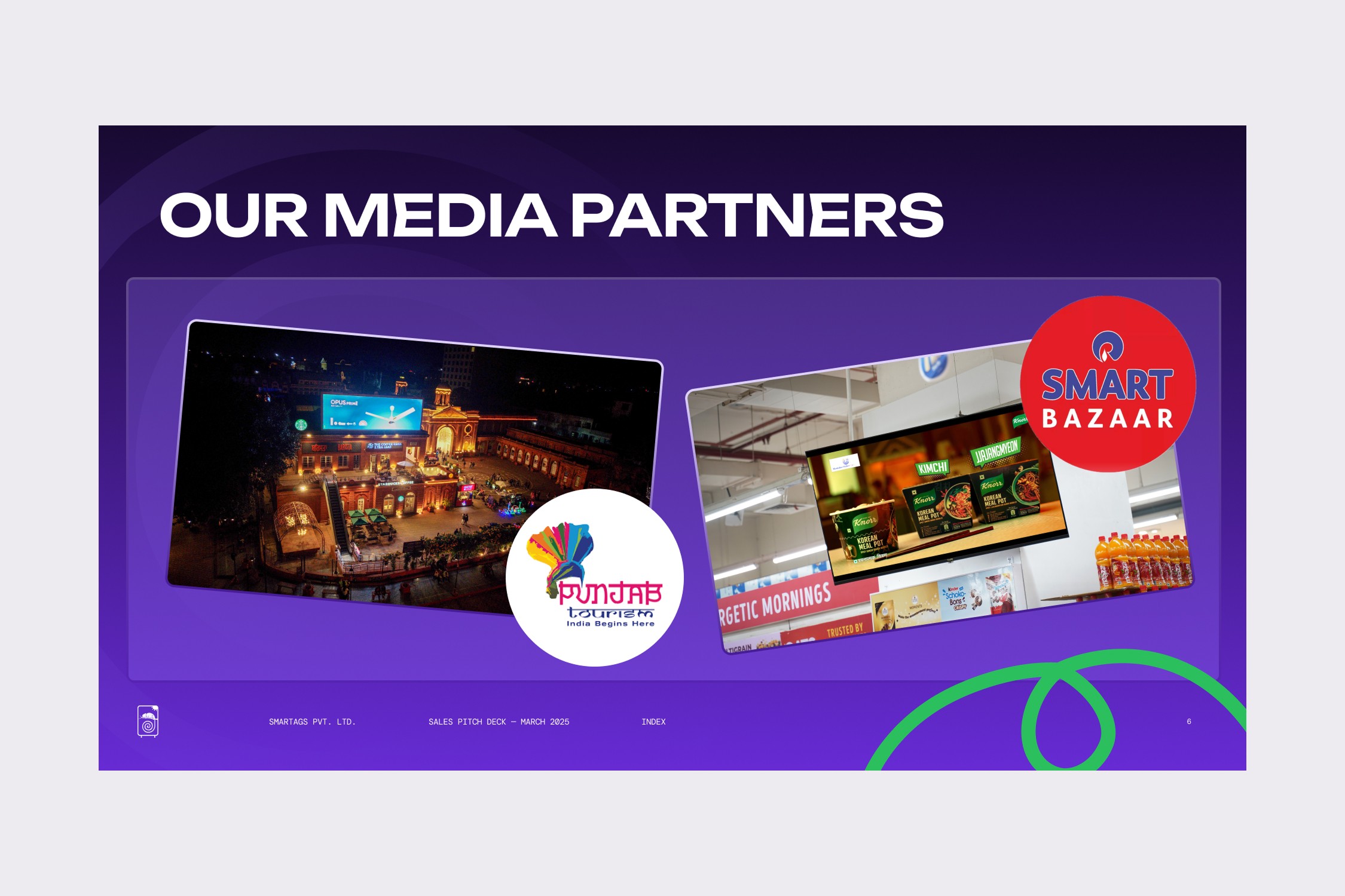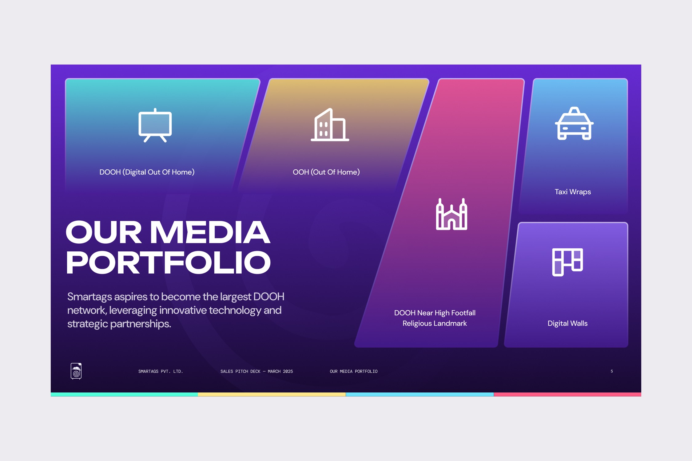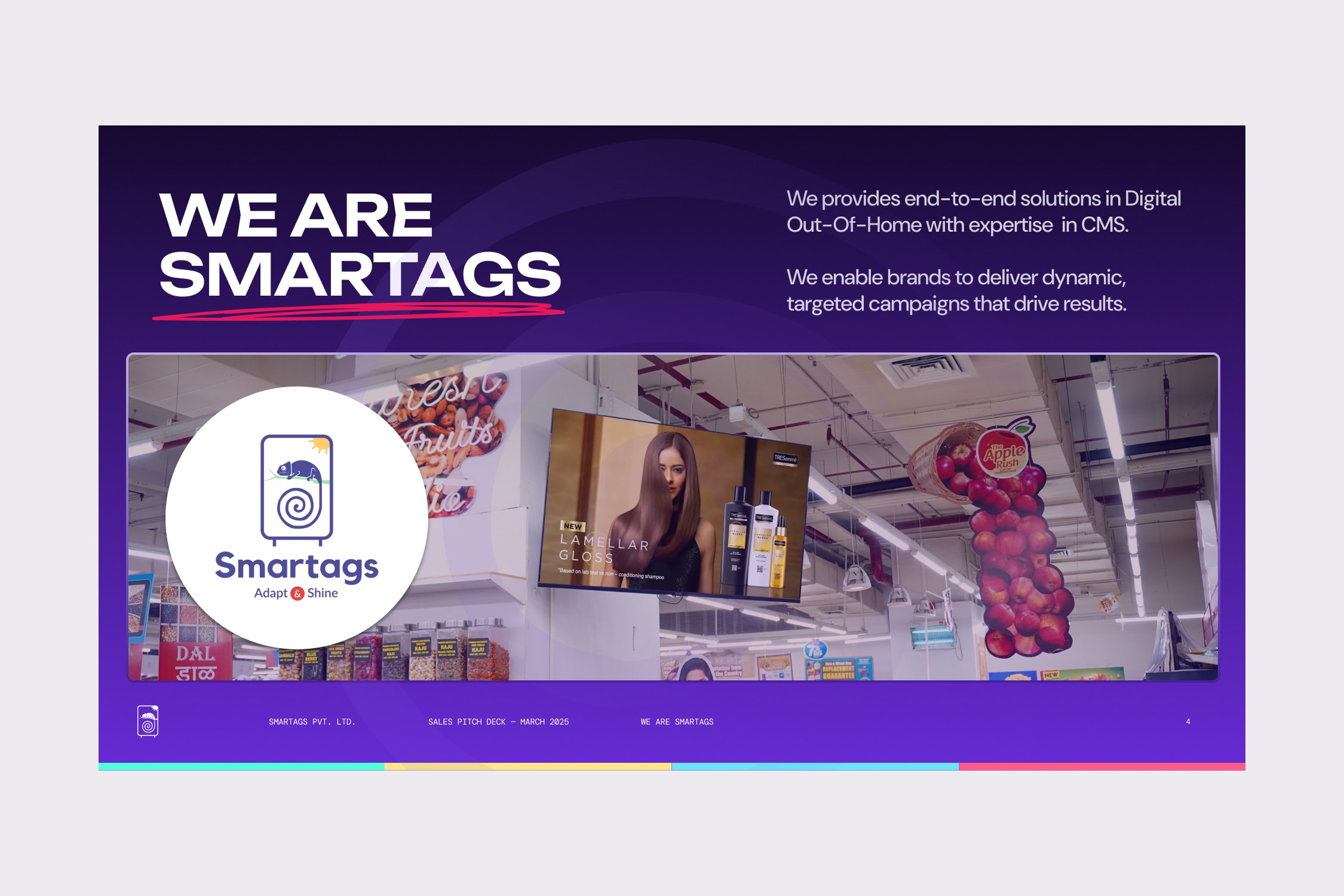 Smartags Private Limited is an India-based AdTech and digital advertising company specializing in Digital Out-of-Home (DOOH) media, digital marketing, and tech-powered content solutions. Launched in 2021 and headquartered in Mumbai, Smartags helps brands amplify their visibility and engagement through dynamic, data-driven campaigns across digital screens and media inventories in high-footfall locations. It combines strategy, creative execution, real-time content management, and advanced analytics to deliver measurable advertising impact in both physical and digital environments.